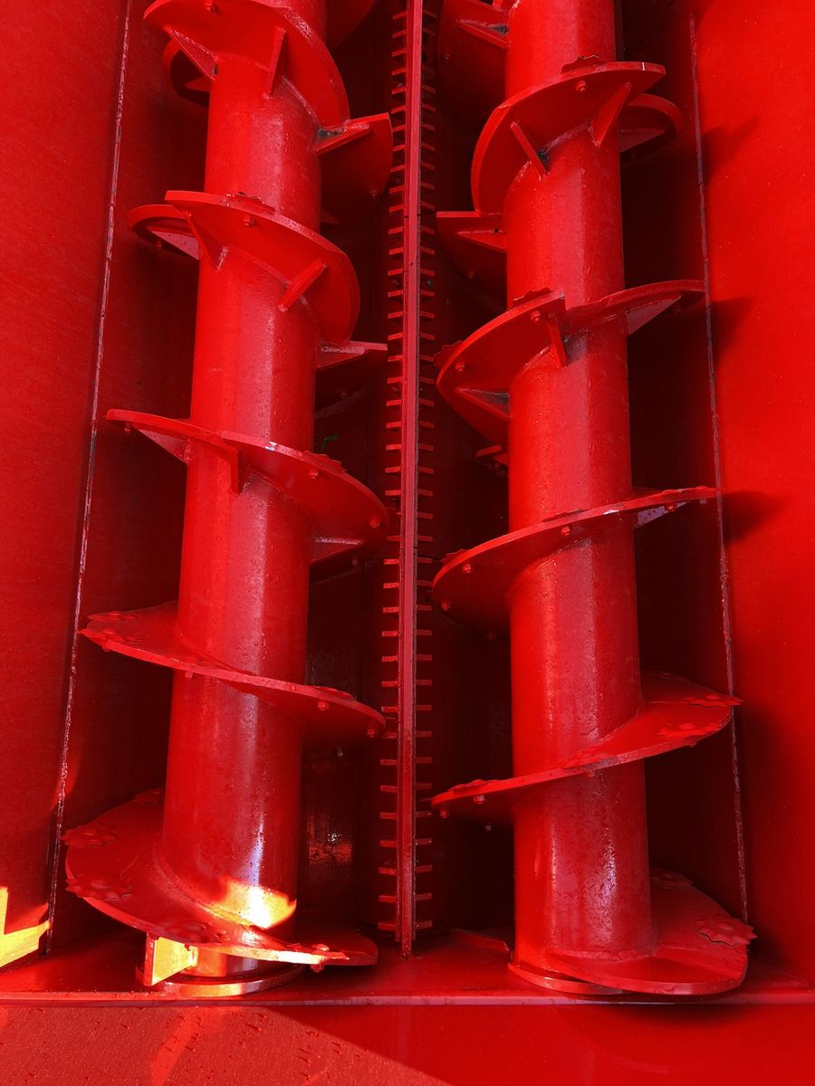 Die beiden unteren Schnecken mit gegenläufigen Spiralen bewirken einen doppelten Materialfluss von vorne und hinten zur Mitte des Mischbehälters.