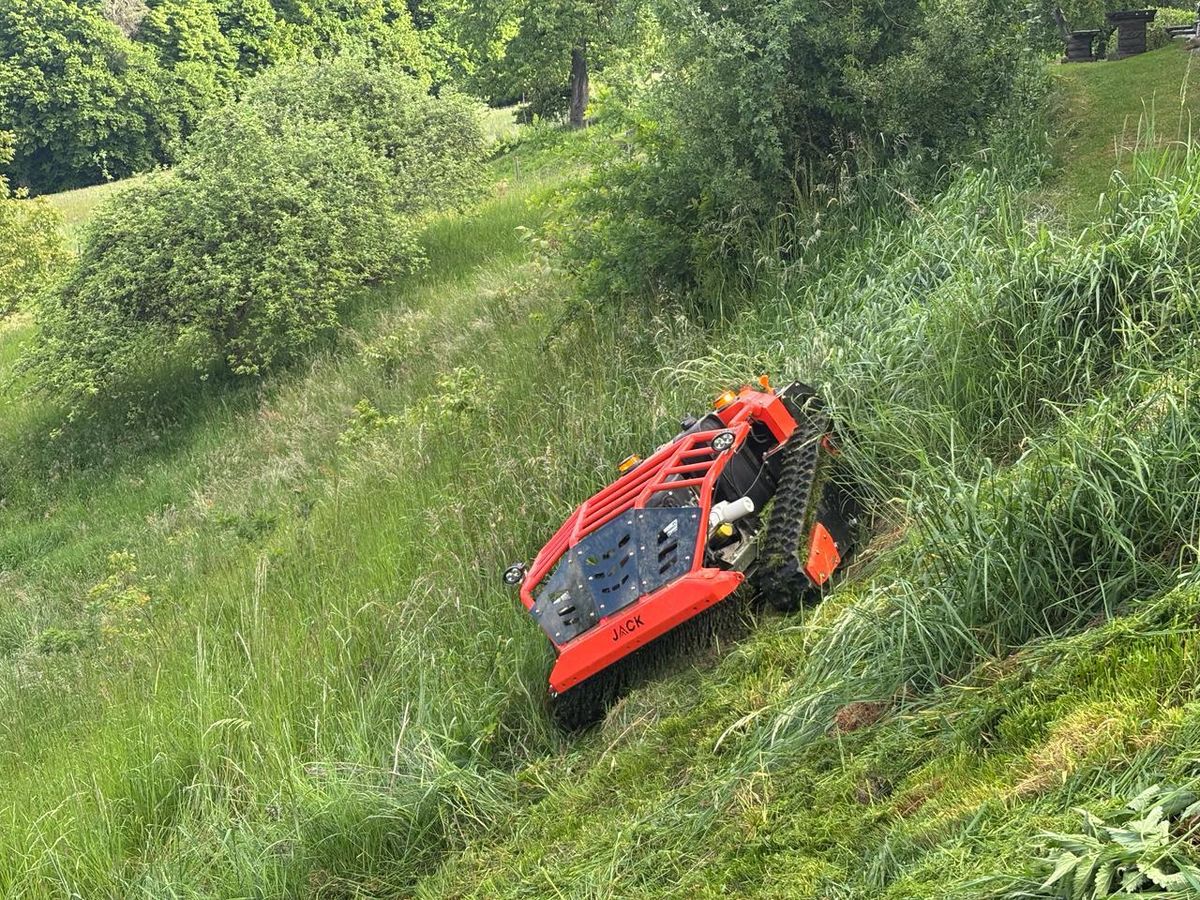Der speziell entwickelte Schlegel-Mulcher mit Y-Messer für Jack erleichtert die professionelle Pflege anspruchsvollster Flächen. Mit robuster Bauweise und intelligenter Konstruktion verarbeitet er dichten Bewuchs und anspruchsvolles Gelände mühelos und sicher. Auch hier kommt das Hybridsystem zum Einsatz: elektrischer Antrieb beim Anfahren, Benzinmotor im Betrieb. Ausgestattet mit einem 23 PS Benzinmotor, bearbeitet der Jack Schlegel Flächen bis zu 4.000 m² pro Stunde, bietet eine stufenlose Schnitthöhe von 10 bis 150 mm und ist für Steigungen bis 100 % ausgelegt. Zuverlässige Steuerung per Funk, Sicherheitsfunktionen und ein robuster Kettenantrieb garantieren Effizienz und Sicherheit in Hanglagen.