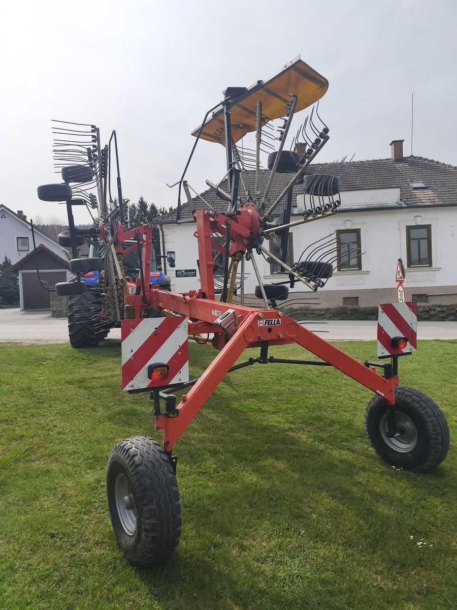 Gebrauchter Fella Seitenschwader 1402 Juras. In sehr gutem Zustand 10/12 Zinkenarme, Arbeitsbreite 6.63m, Transporthöhe 3.60m, Transportbreite ca. 2.97m, 2 Schwadablage, Doppelte WW Gelenkwelle, sofort verfügbar