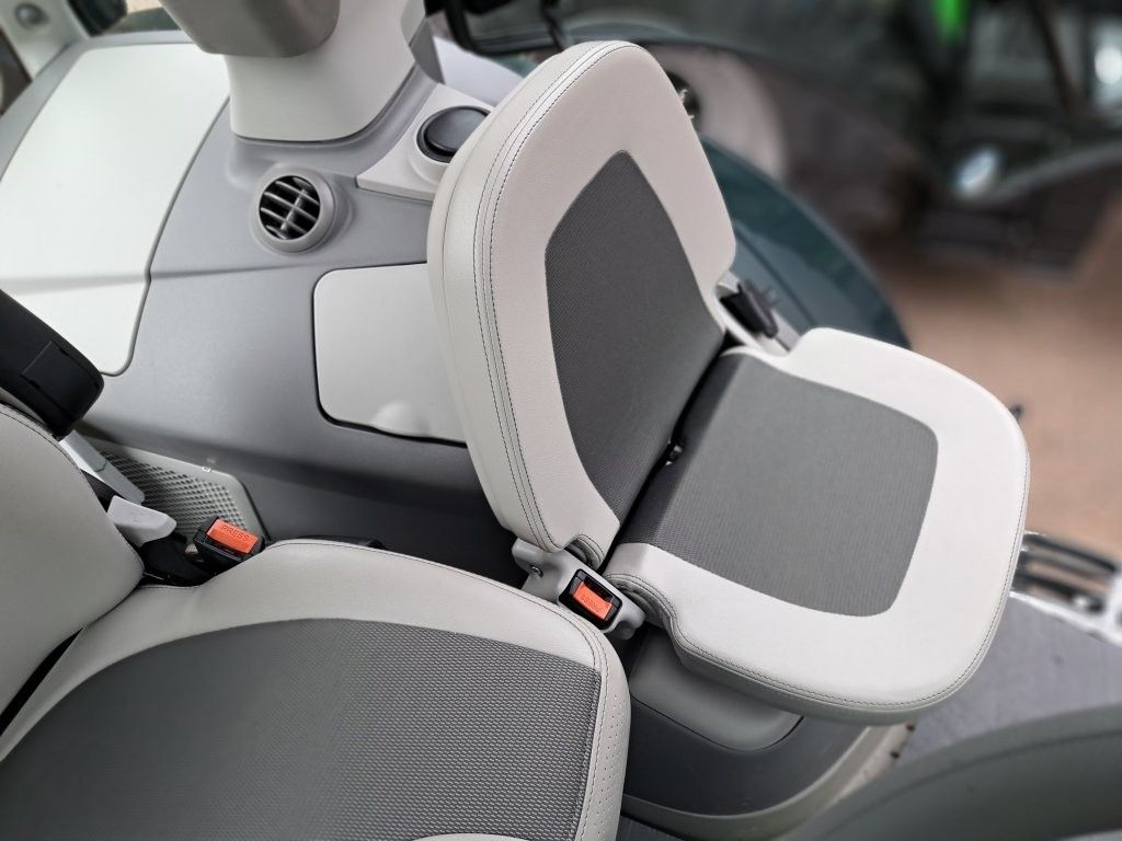 Die Kabine des 6160 POWERSHIFT bietet dank der Klimaanlage, der Kabinenfederung und dem komfortablen Luftsitz ein hohes Maß an Fahrerkomfort. Die Bedienung wird durch ein RTK-Lenksystem am Traktor Terminal unterstützt, das präzise Lenkmanöver ermöglicht. Die elektrische Steuerung über Kreuzsteuerhebel und die automatische Anhängevorrichtung erleichtern die Arbeit zusätzlich.